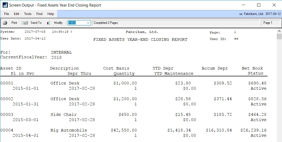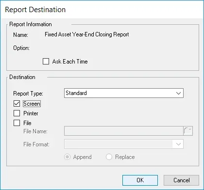 This is fairly straightforward: there is nothing to configure. When you start the Fixed Assets Year-End Close routine, it now prompts you for a report destination for the Year-End Closing Report: