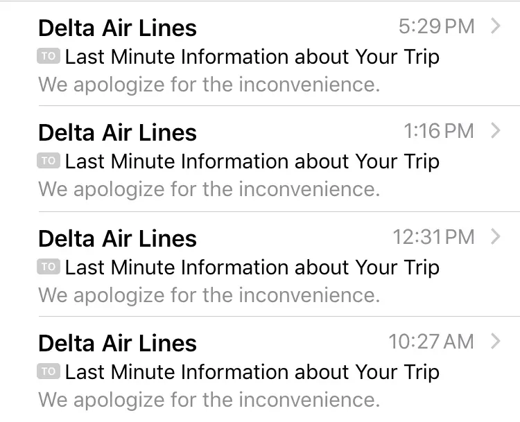 So, I decided to change my flight entirely to Monday and postpone training. I had already left for the airport for what I thought was a 7:30 pm departure when I received the last notification. I was on the phone with Delta the entire drive to Toronto working through my options.