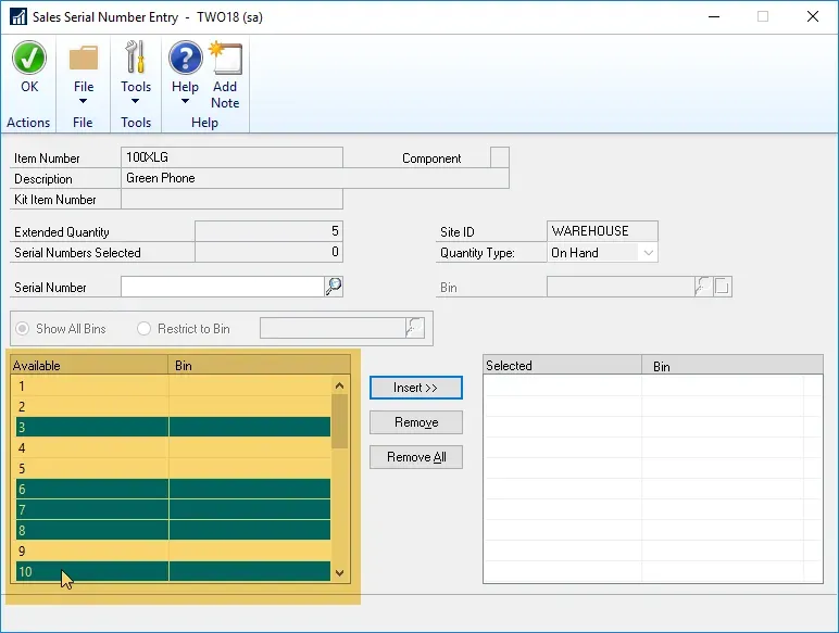 Yes, this minor feature added in GP 2015 allows a user to select multiple serial numbers instead of clicking and inserting one at a time. In my example below, I’m specifically selecting random, non-sequential numbers. To do this, use the CTRL key to multi-select click on all the numbers and insert once.