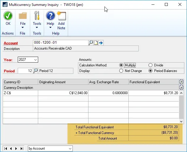 The balance in this account should be 100% Canadian dollars, in this case; there should be no functional currency entries at all. The balance in this account is zero from a functional standpoint, however, there is a CAD balance and there is an amount in USD (Fabrikam’s functional currency). I never want to see this in this situation.