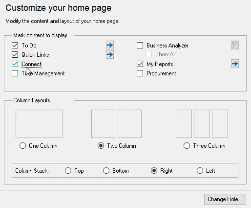 To change roles, first, click on the Customize this Page link on the homepage (the screenshot above), and click on Change Role at the bottom. First, the user will have to acknowledge a warning message that their customizations will disappear.