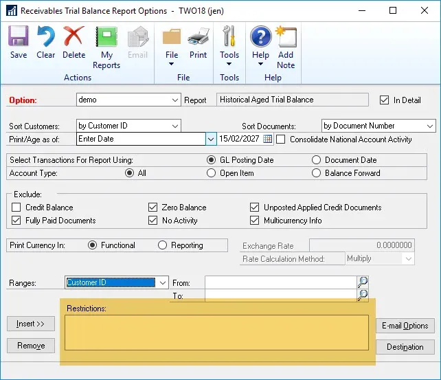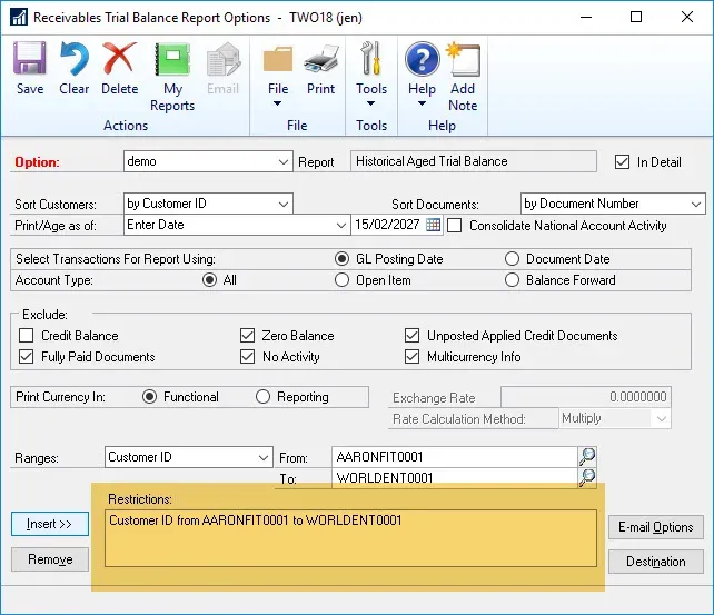 Here’s an example of a Receivables Management Historical Aged Trial Balance and its Report Options window. The report is set up to run this particular report with an aging date of Feb 15, 2027 (sample data). There is a Customer ID restriction which represents the entire customer list in the TWO sample data.