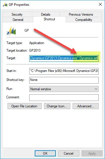 Right-click on the Properties of the shortcut, and in the target, put in the name of the alternate Dynamics.set file “Dynamics-DEV.set” for instance. Now launching that will launch the .exe with that .set file.