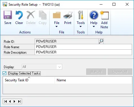On the Security Role Setup for POWERUSER, it has no tasks assigned to it, it cannot be deleted and nothing can be assigned to it. It’s effectively hard-coded access to anything on GP. Nothing is explicitly granted, so it’s invisible.