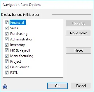 In the next window, Navigation Pane Options, a user can hide/show and re-arrange the navigation panes. What is in this screenshot is the default Dynamics GP installation plus HR/Canadian Payroll, Project Accounting and Professional Services Tools Library.