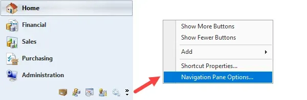 To edit that, click on the tiny drop-down list at the bottom of the navigation pane, and then select Navigation Pane Options from the pop-up menu.