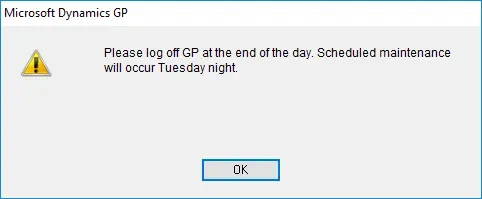 Overall, it’s a small utility but useful when all I want is to easily notify my users to log off GP for a specific reason, vs. other alternatives that are outside of GP.