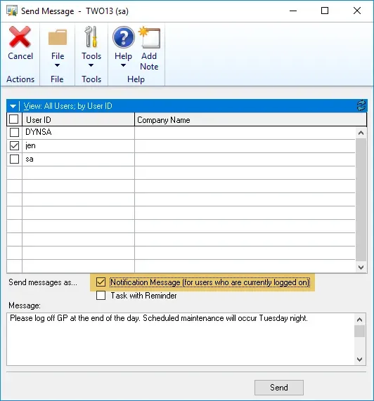 Today’s #TipTuesday post is a simple one, and it’s about user notifications. In Dynamics GP 2013 R2, the “Send Users Message” feature was introduced as an easy way to send a notification to users who are logged in or to add a task to the users’ reminder list in Dynamics GP.