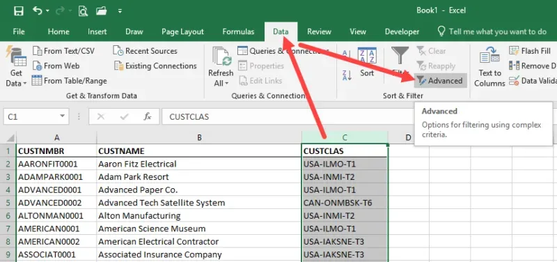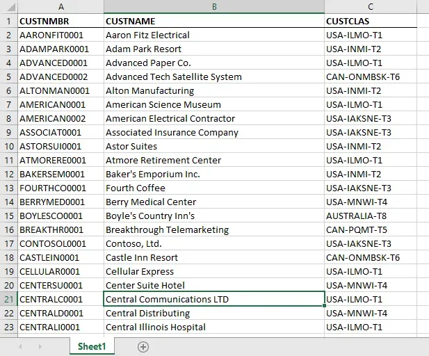 Here’s my sample data: from the RM00101 table in Dynamics GP’s TWO database. I copied the customer ID, name and class into Excel as a quick set of sample data.
