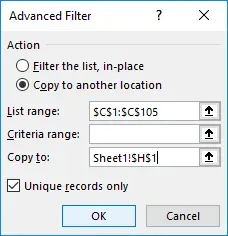 In this pop-up window, you will mark the 2nd Action “Copy to another location”, as well as mark “unique records only”. This means you only want 1 of each value.