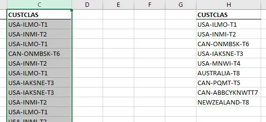 Here’s the end result: starting in H1 both the title and the unique values were pasted along with the formatting (surprisingly enough!). The Title was copied because I highlighted the entire column, and thus it was one of the “unique values”.