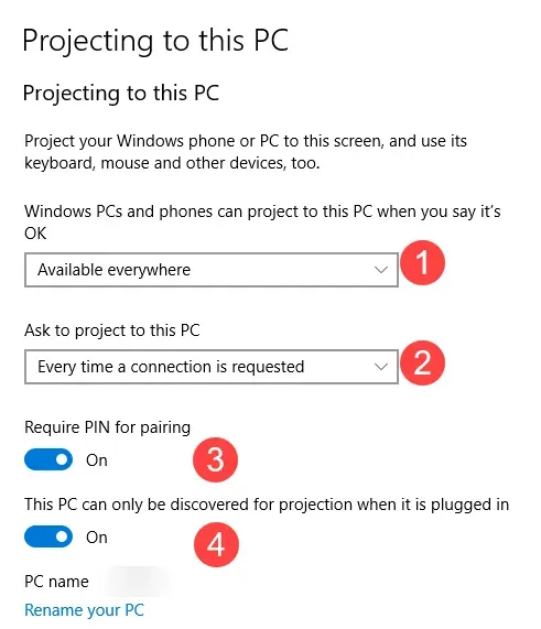 - Where should this option be available? I chose Available Everywhere but could have chosen an option to only have it available on secure networks. I will likely be turning this off entirely if I don’t plan on using this often so the PC isn’t always “looking” for opportunities to be a projection device.