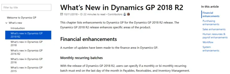 Right now, users will find What’s New information for GP 2015 through GP 2018 R2, by release. On the left-hand side will be a navigation for other documentation items as they become available and on each article page itself, the right-hand side is a navigation within an article of the different major sections.