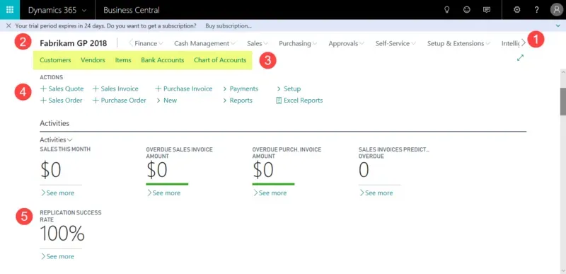 Before I get into replication, here’s what the “main page” looks like when I log into Business Central. I’ve numbered a few things but there is more on the page below I won’t get into. To be honest, so far 90% of the content appears to be enabled because I mistakenly turned on a full Business Central trial. I am curious to wait until that is over to see what is left for “just” Intelligent Cloud.