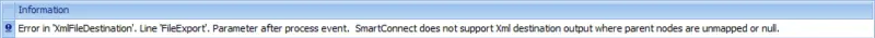Alas, the file format proved to be too complex for SmartConnect. I won’t go into details on this one. I imported the sample XML file I mocked up and mapped the fields and it was SO EASY, but when I ran the map, I got this for each record in my source: (“SmartConnect does not support XML destination output where parent nodes are unmapped or null.”).