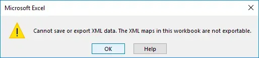 The look on my face when I realized it wasn’t as easy as I first thought was priceless, I’m sure. “Oh shit” came to mind, but with a worse choice of words mixed in there. There were a couple of errors I got, either this one that says “Cannot save or export XML data. The XML maps in this workbook are not exportable.” or a sister message to it (which I don’t have a screenshot for) relating to there being “denormalized data” and thus it wouldn’t export either.