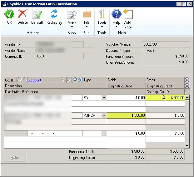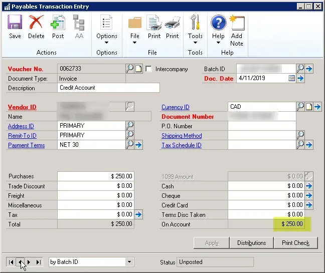 Here’s my payables entry (one example): a $250 document.