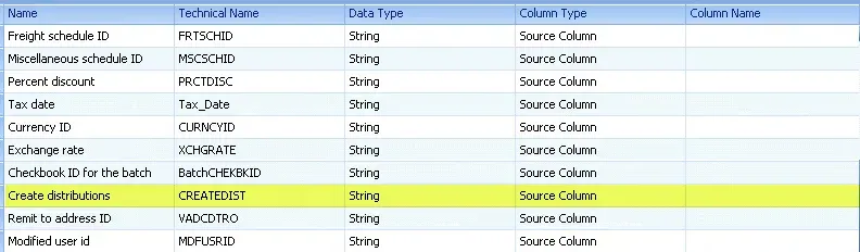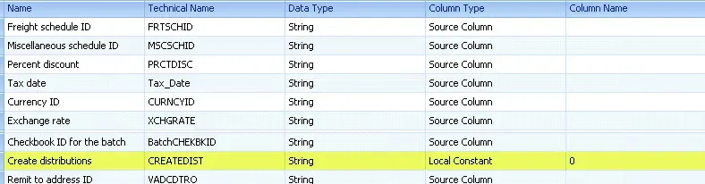 This is on the line “Create Distributions” and the value that is defaulting, if I do not explicitly map otherwise, is a 1 (which means “auto-create GL distributions” using the default posting accounts). However, my SmartConnect mapping looked like this: it wasn’t mapped.