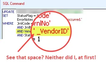 I was convinced the Document Fail and Document Success tasks were not firing because my data wasn’t getting updated with the proper Failed or Completed flags. When I went to copy my update script into SQL Server Management Studio to ensure I wasn’t missing something simple on the syntax, I saw the issue: a space I missed updating before the “vendor ID” variable name. Ugh.