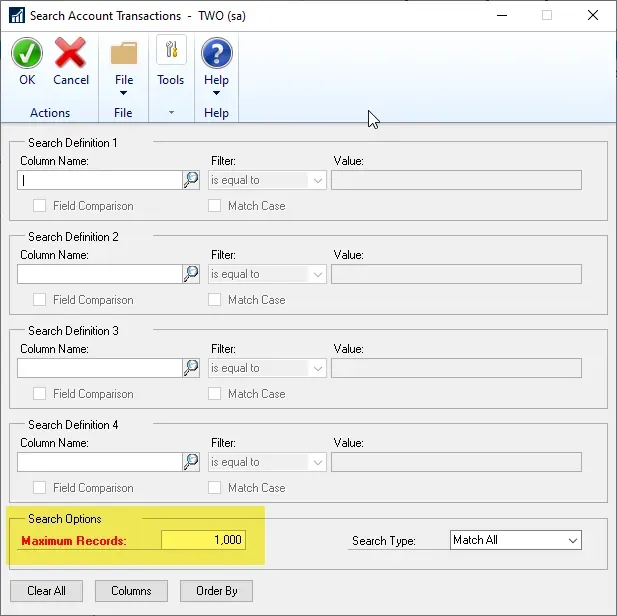 Regarding the number of records, the “First XXX” is very important. I wrote a post a few months ago about the system SmartList Options window which (among other things) includes a setting for each SmartList Object’s maximum number of records. The default for all objects is 1000 records, but this can be changed for any single SmartList Object individually. That post has the details.