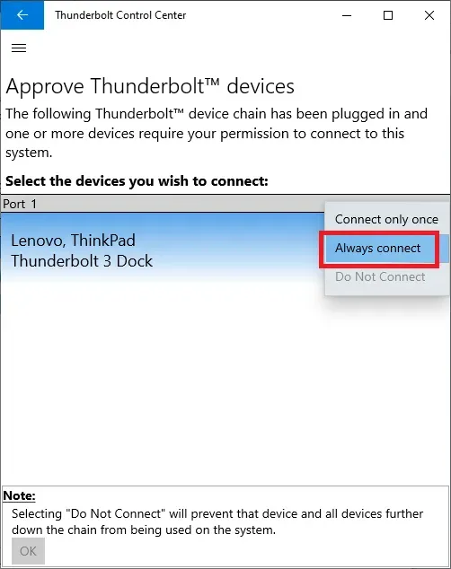 As soon as I launched the app, it saw my Lenovo dock but it said it was not connected. I clicked on that, told it to “Always Connect” and voilà, everything started working.