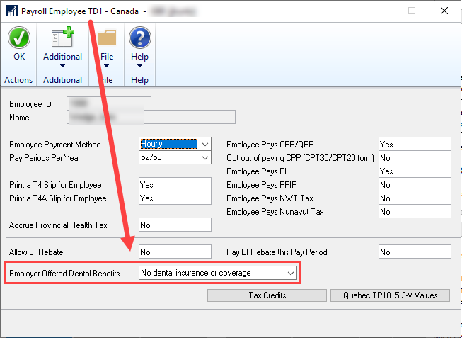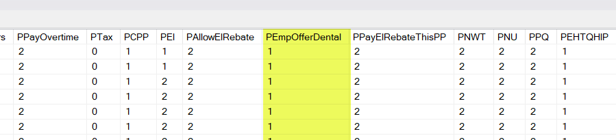 After the Dynamics GP Year-End 2023 update is installed, some of the tables include new columns for the Employer-offered Dental Benefit tracking now required on T4 and T4A forms. The default value for all employees is a value of 1 in column “PEmpOfferDental” which corresponds to “No dental insurance of coverage of any kind”.