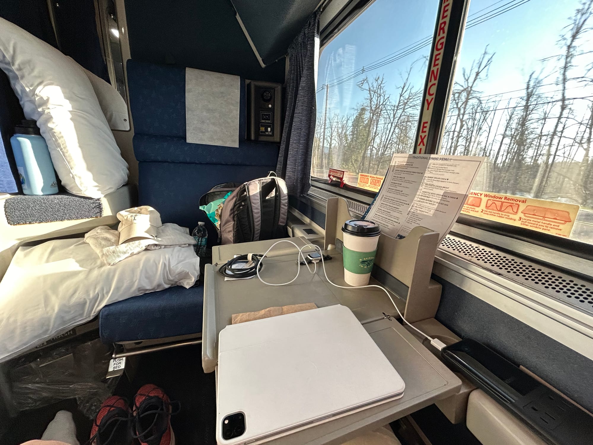 Later in the day, they dropped me off at the train station for the remainder of my trip to San Jose. The rest of the trip was overnight and I managed to snag a late upgrade into a “roomette”, which is a private room for up to 2 people. Trust me when I say you’d better know the 2nd person well! It’s a very small space, but it was a fun experience, and compared to the coach seating I had originally purchased, it was great to have some privacy for that long of a trip plus having a bed to sleep in overnight. The views were tremendous. The sleeping accommodations were fine, comfortable enough for the night, and it was enjoyable vs. flying or driving. When I went for dinner, the porter converted the roomette into a bed, with a thin mattress, clean sheets, a blanket and a couple of pillows. Had there been two people in the room, an upper bunk would also be converted to a bed.
