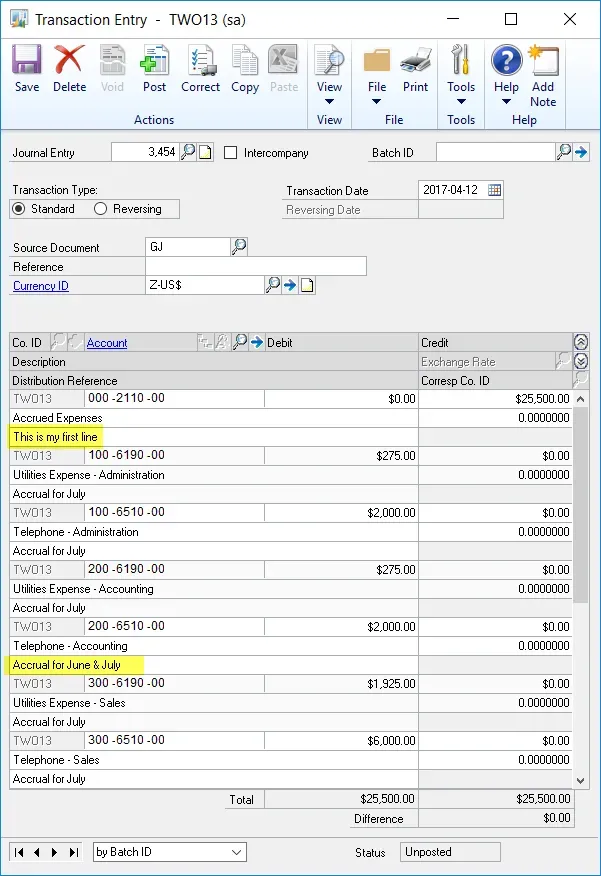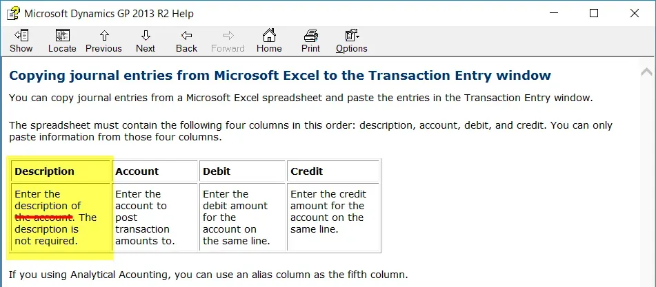 Notice the line item descriptions in mine match what I copied from Excel, proving the help file is a little misleading in its definition. In this example, I opened the window and clicked Paste when my cursor was still on the Journal Entry Number field, and it worked just fine.