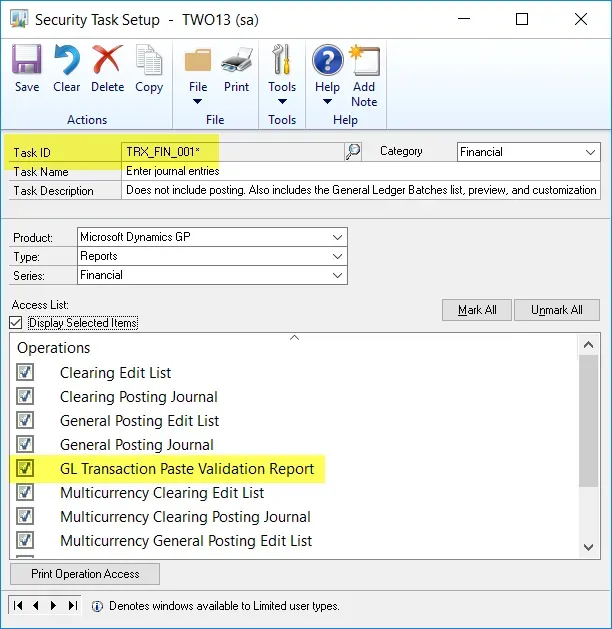 If you upgraded to GP 2013 from an earlier version, chances are the new report isn’t in any of the security tasks. On a new install, this report is included by default in task TRX_FIN_001* so that is a good place to include this report if it isn’t already there. It’s under Microsoft Dynamics GP > Reports > Financial in the task setup drop-down lists.