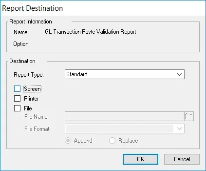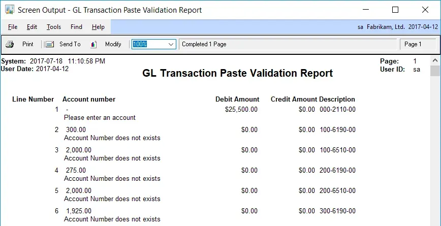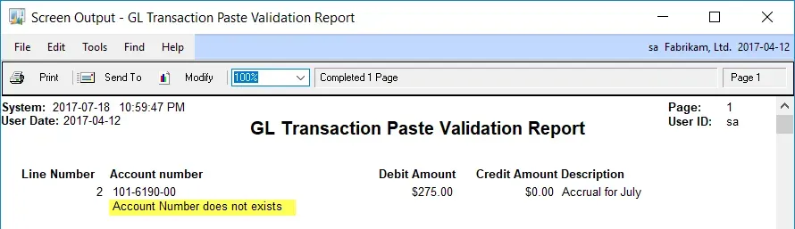 If there is an issue with the journal entry, you will be prompted to view the “GL Transaction Paste Validation” report. I don’t have AA installed to test what validation occurs with that; however, without AA, it’s only validating that you are using GL accounts that exist.