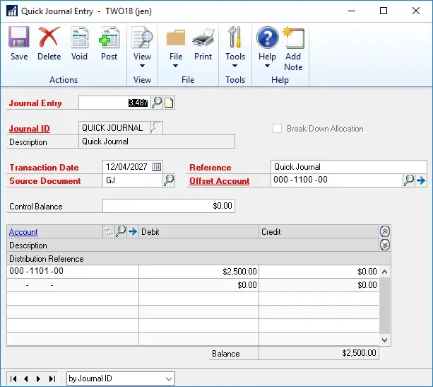 The last of the oddities is the Control Balance field on the Quick Journal Entry window. It’s not required, or is it? Well… it’s been a while since I’ve used Quick Journals and I’m testing/writing this with GP 2018. I don’t recall it working this way but here goes: I can leave the Control Balance at zero and it will allow me to post the entry OR the Control Balance must be the amount that will hit the Offset Account. This error text if it doesn’t match, would say “You cannot post. Transaction balance does not equal the control balance.”.