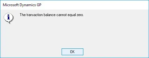 Here’s one error message a user could get if they mistakenly created a Quick Journal with the intent of having a balanced journal entry. If I were to create an entry where the detailed lines contained a net-zero balance, so that there is nothing for the Offset Account, I would get this error message: “The transaction balance cannot equal zero.”.