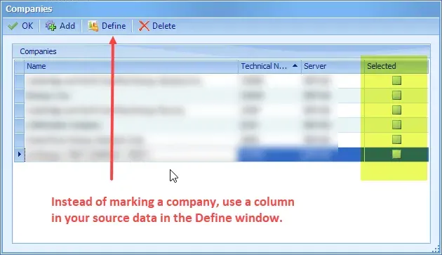In the Companies window, leave the companies themselves unchecked. Click on the Define button. Ensure the data source has a company column (it can be named anything, “company”, “database”, etc.). As long as there is some data in the source that I can determine what database to integrate to, I can use the Define feature (for instance, with If/Then statements to tell SmartConnect what to map to when).