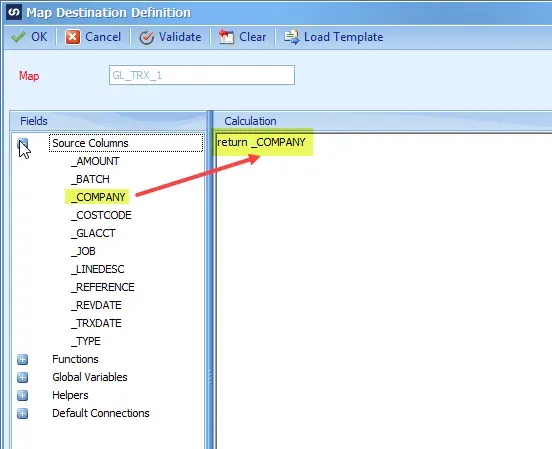 In the simplest form, if the source document template has the database name like mine does, I simply want to define the company as “return” and the field name that contains the company. If that will not be the actual SQL database name, this needs to be expanded into an If/Then code block to translate the input into a database.