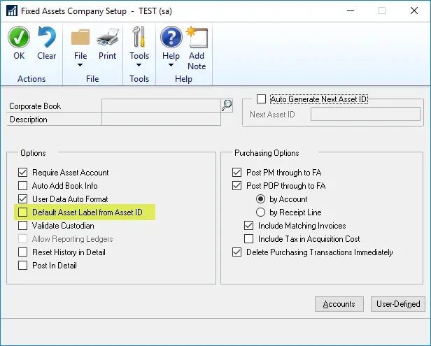 - Hybrid suggestion: if the organization wants to use Asset IDs for Asset Labels, I would highly recommend marking the box indicated above in Company Setup to default (fill) the Asset Label field with the Asset ID and *reference that field* as the field that ties to the asset label/tag. Down the road, if reasons cause a change in the ID naming convention or the labelling, then there are options to separate the two things, even though most labels defaulted from the ID itself.