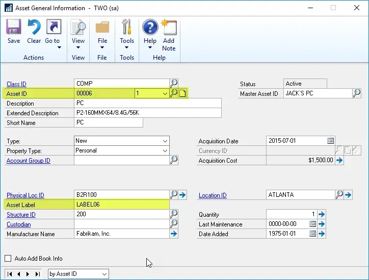 - Asset IDs are fixed – kind of. All IDs in Dynamics GP are fixed and some can be changed with tools like PSTL[1] as mentioned above. Changes in IDs should be relatively rare occurrences, not everyday situations. The Asset Label field is editable, making changes very easy. (A clear process needs to be established on who has access to the FA General window because the Asset Label field *is* easily editable. This is an ideal field to use something like Field Level Security on to protect it from random edits if this is a concern.)