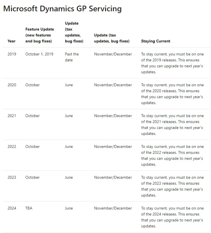 Here’s a snapshot of the years and timing for Dynamics GP (October 2019 release and beyond), through 2024.