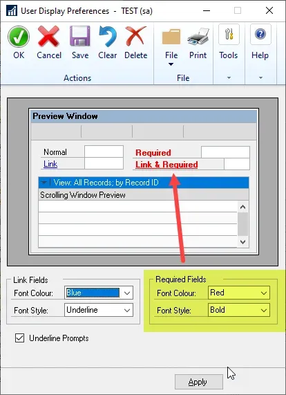 The default user setup will display Required Fields in Black, Regular style, which means there is no differentiation between a Required field and an Optional one. There aren’t many choices in the Display window, the colour can be Black or Red, and the style can be Regular or Bold. I recommend that every user set their required fields to Red and Bold for optimum visibility.