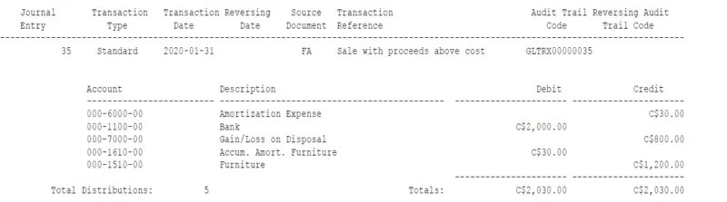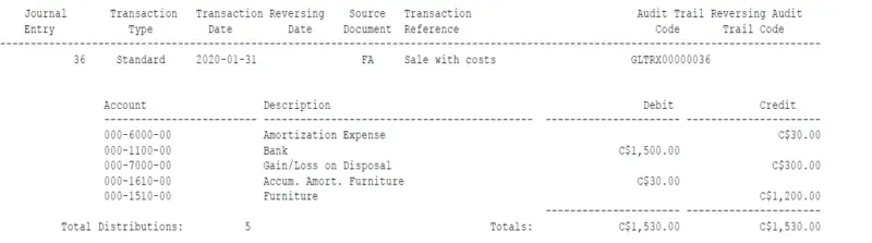 After backing out YTD amortization, the net result is a Gain on disposal of $800. In the screenshot below my default Proceeds account is my Bank GL, which is what is also used for the Non-Cash Proceeds journal entry.