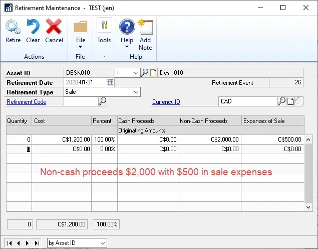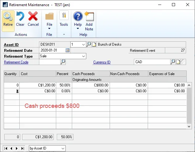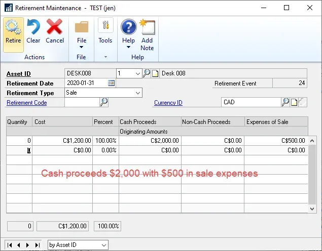Today’s #TipTuesday is a continuation of what happens during Retirement transactions in Dynamics GP. Today is the last of the “retirement” scenarios I plan on covering and it is proceeds (cash, non-cash), sale expenses and their impact on the resulting retirement journal entry.