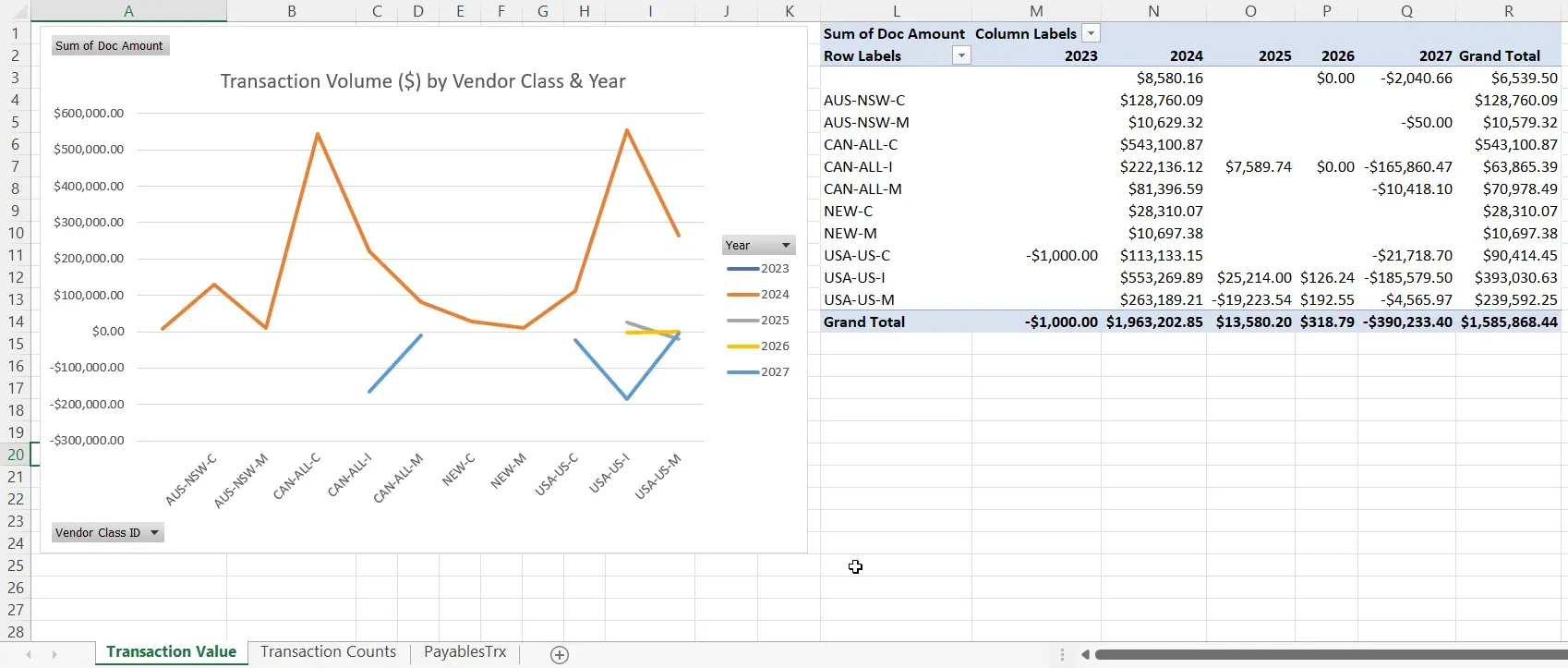 This one is a Pivot Chart, a line chart, analyzing transaction dollars by year and vendor class.
